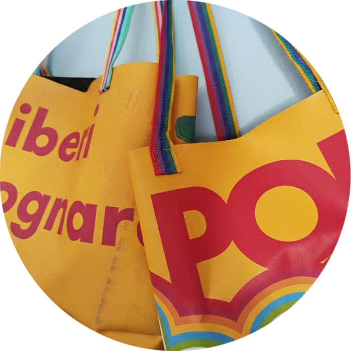 Upcycling-Workshops Für Organisationen, Museen, Unternehmen, Veranstaltungen und andere Orte, die wiederverwendbare Werbebanner zur Verfügung haben. Kontaktieren Sie mich, um die Eignung des Materials zu prüfen und ein individuelles Nähprojekt mit speziell für den verwendeten Bannertyp erstellten Schnittmustern zu entwickeln.
